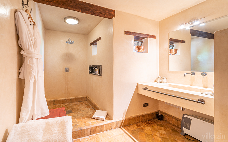 Un deuxième pavillon construit en pierre de l Ourika, le pavillon Musc est juste à côté de la salle de fitness, il fait les soixante mètres carrés avec un coin salon cheminée, une grande chambre, et un dressing et salle de bains aux plafonds en voûtes de briquette.
