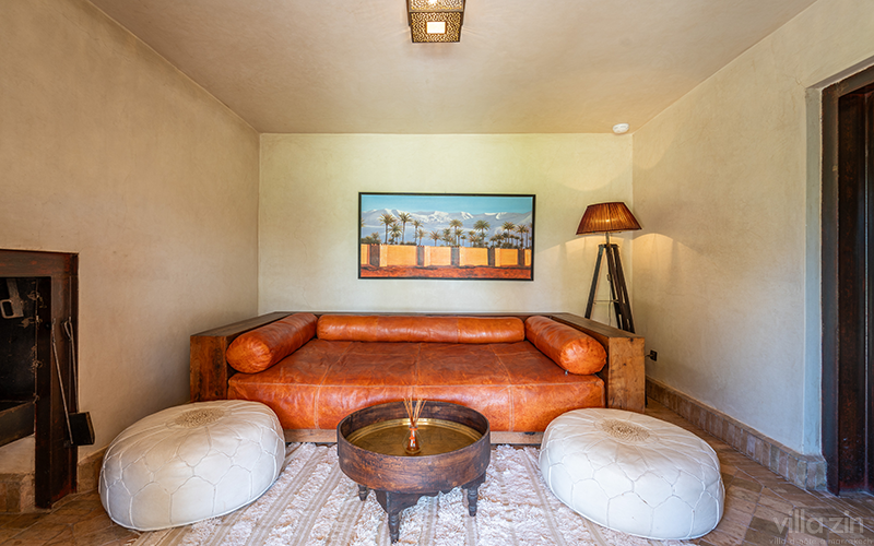 Construit avec la pierre de l’ourika, dans ce pavillon la décoration met a l honneur le mobilier rural berbère, beaucoup de bois et de cuir. Sur les sols pavés de Bejmat les « Hendira » brodées de sequins et des tapis de haute laine du moyens atlas.
