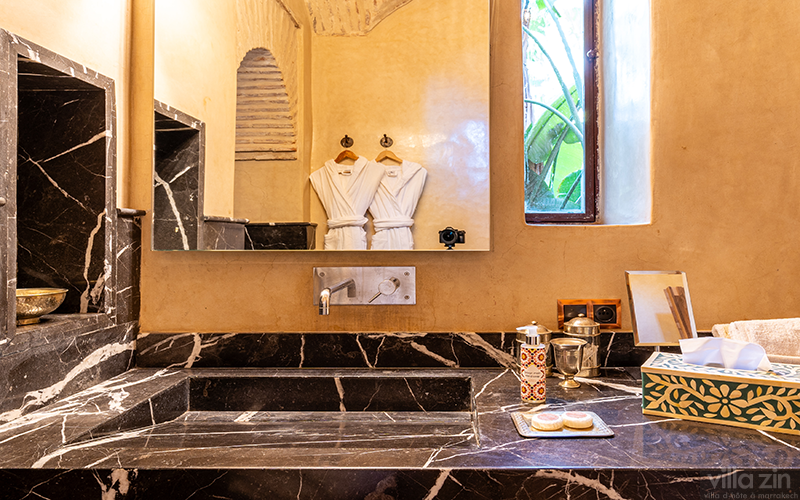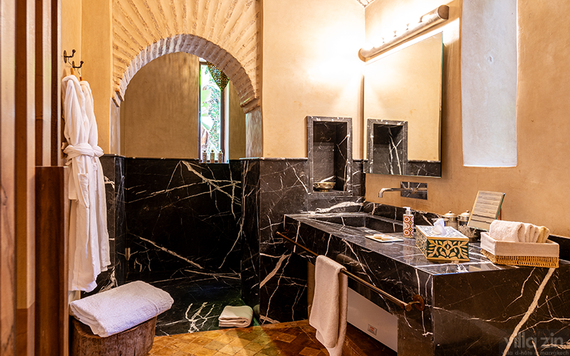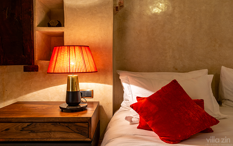Les murs arborent des couleurs sobres de Tadelaket et habillées de décoration boisée au style méditerranéen. Des lanternes marocaines disposées de part et d’autres du lit jouent à merveille le rôle de lampes de chevet et permettent de diffuser une lumière à la fois tamisée et colorée. L’ensemble de la décoration de la pièce est rehaussé par un linge de lit aux motifs batiks. Enfin, en descente de lit, un salon de thé faussement improvisé complète parfaitement l’ambiance conviviale et chaleureuse de la pièce.
