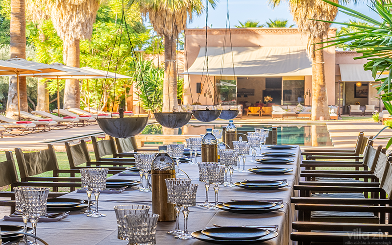 Cette Villa de luxe en location exclusive à Marrakech vous propose une restauration marocaine raffinée, elle exploite la diversité des épices et la fraicheur des produits.
